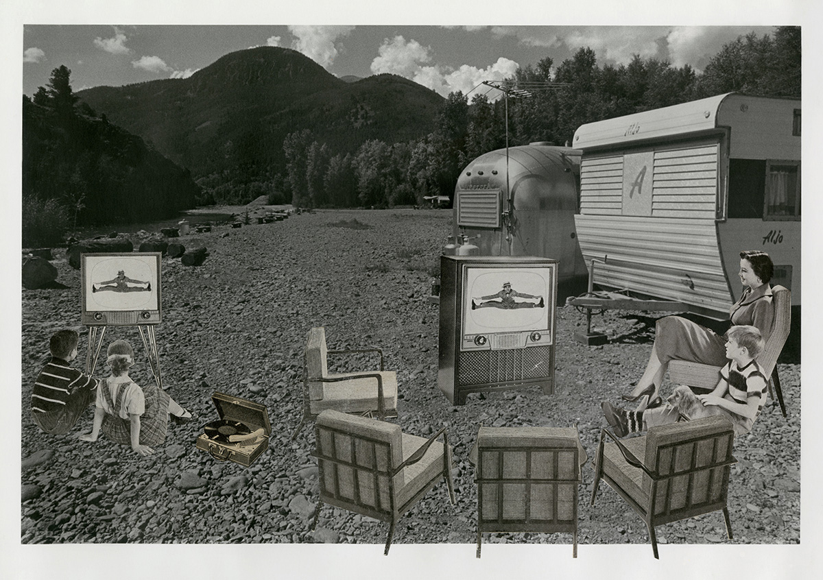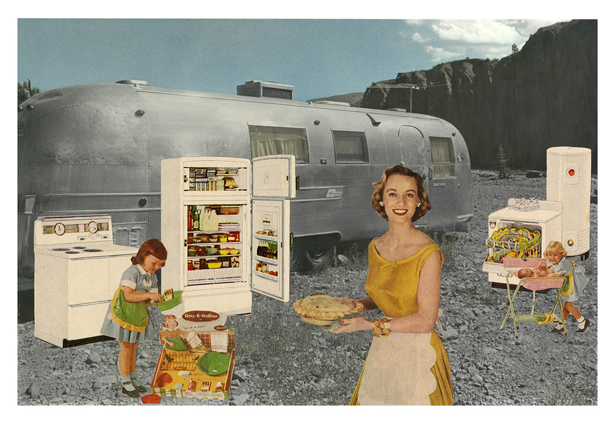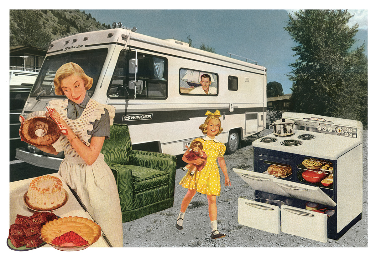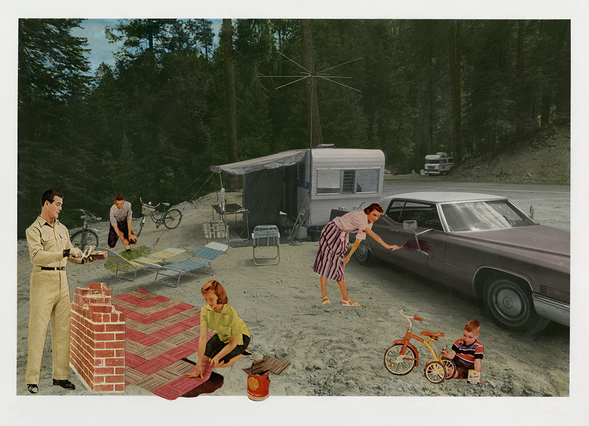 Fessler initially conceptualized the collages as a commentary on the campsites where she stayed in her travels throughout the west. Struck by the number of creature comforts campers brought with them while attempting to get away from it all, she wanted to poke fun at this phenomenon. As the first image took shape, she realized the characters she had inserted were representations of her own family. The series was her first autobiographical work and the beginning of her interest in appropriating images to comment on the role of the media in creating and perpetuating stereotypes.