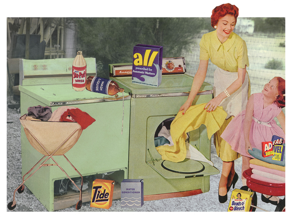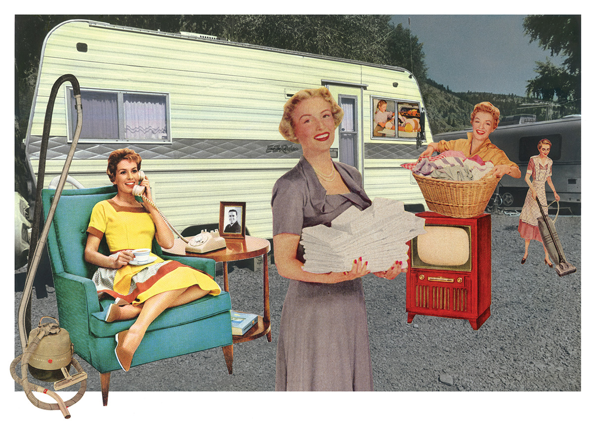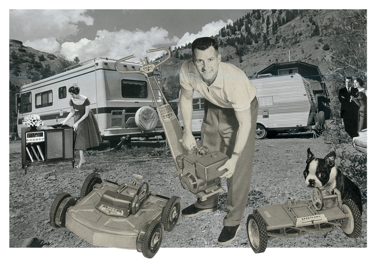 Fessler initially conceptualized the collages as a commentary on the campsites where she stayed in her travels throughout the west. Struck by the number of creature comforts campers brought with them while attempting to get away from it all, she wanted to poke fun at this phenomenon. As the first image took shape, she realized the characters she had inserted were representations of her own family. The series was her first autobiographical work and the beginning of her interest in appropriating images to comment on the role of the media in creating and perpetuating stereotypes.