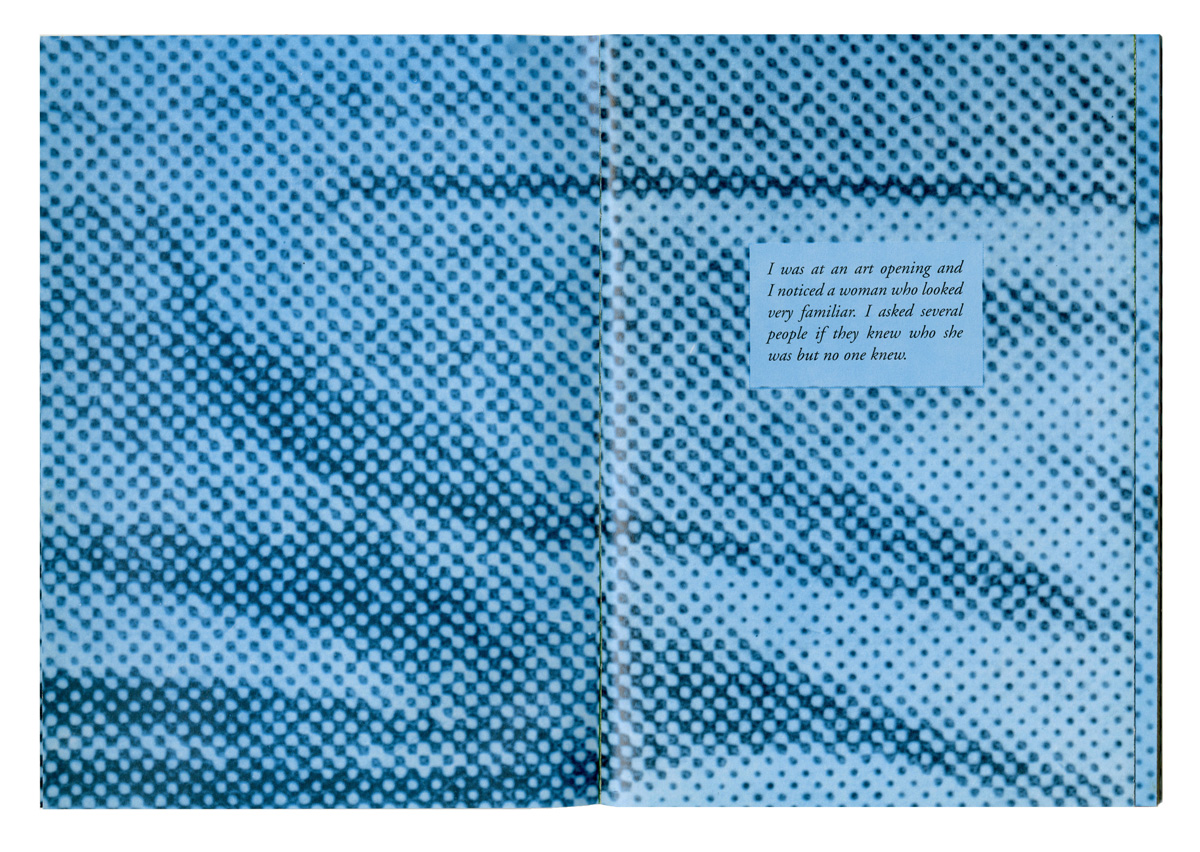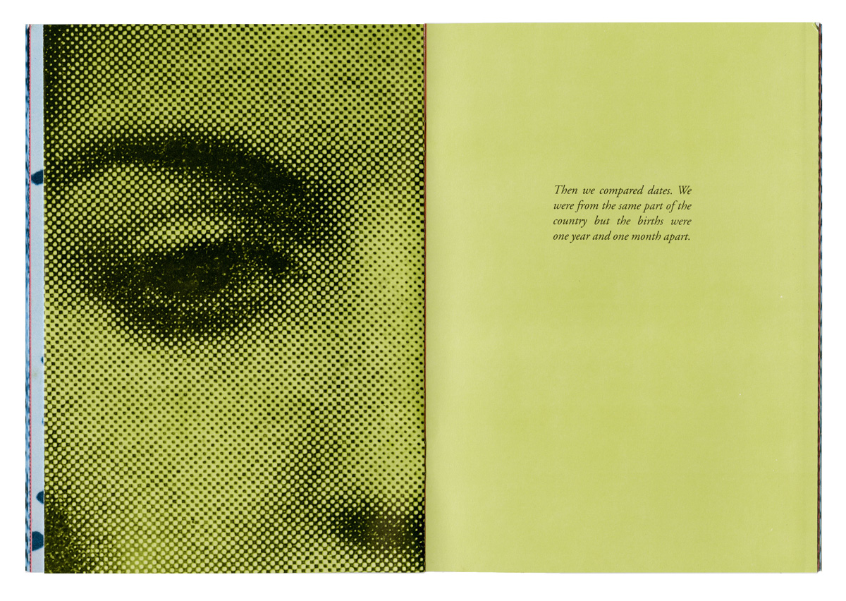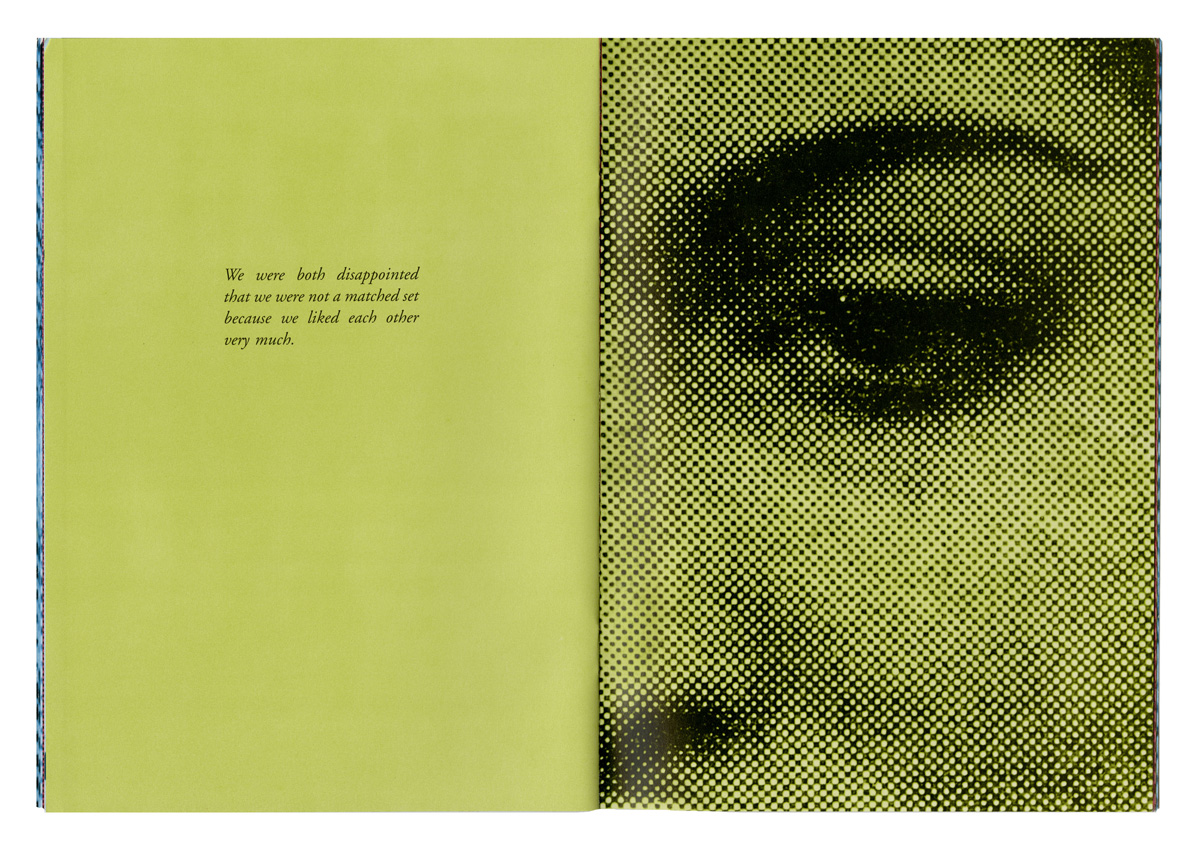moment —they can see the right half of the woman’s face on the next page, and a complete face is visible. But after the page has been turned, on the left side we read “We were both disappointed that we were not a matched set because we liked each other very much.” To the right we see half of a face. The potential for wholeness proves to be allusive.