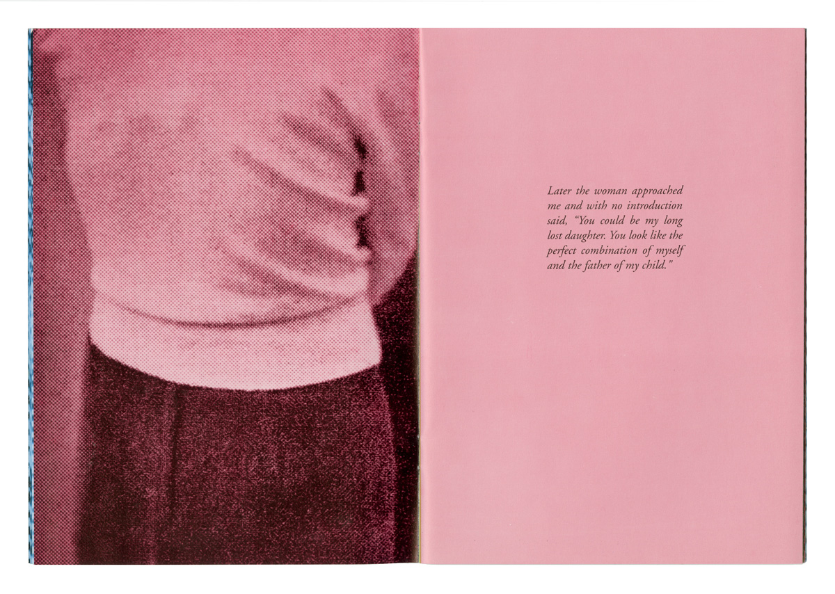The book opens with a story. Fessler is at an art opening and notices a woman who looks very familiar. She asks several people if they know who she is, but no one knows. When readers turn the page, they find a close-up image of a woman holding a newborn baby up to her face. It then becomes apparent that the image has a gatefold on the left side that can be opened. When opened, there is an extreme close-up of a man’s face on the fold-out page. The close-up suggests intimacy between the man and woman, as if he is looking over her shoulder at his child.
