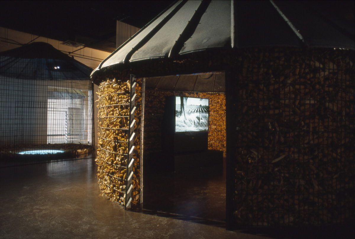 In the Everlasting: Baltimore, 2003, installation viewers first encounter an enormous corncrib that fills the darkened two-story atrium of a building that was formerly a train station but now serves as entry to the Decker Gallery at the Maryland Institute College of Art. A video projection on the roof of the corncrib gives the appearance of sunlight filtering through the branches of a tree, causing the shadows of leaves to flicker on the metal surface. Sounds of a farm on a summer day draw viewers into the main gallery where they experience an expanded version of Fessler’s 2001 Close to Home installation.