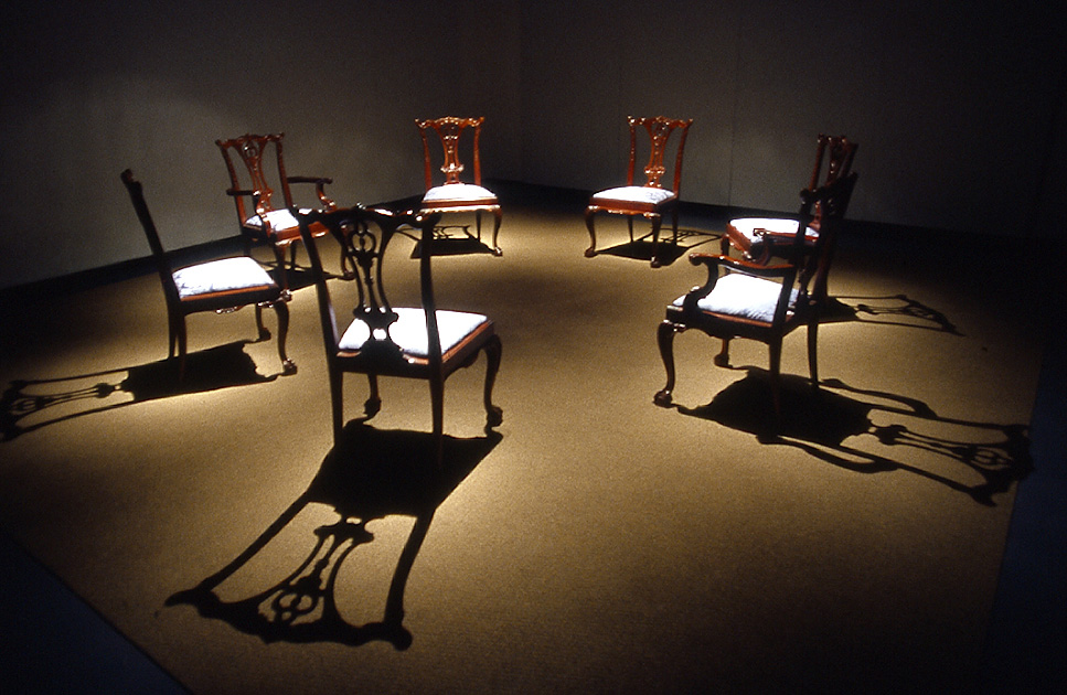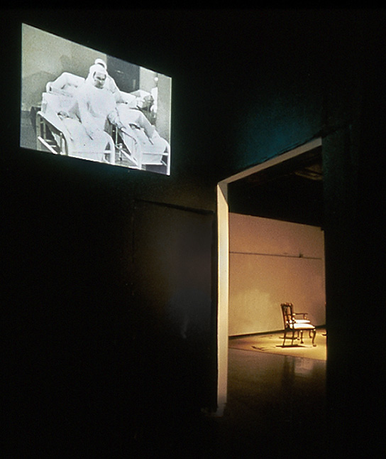 Medium: Site-specific surround-sound audio composition created from interviews with 7 women from the Baltimore/Washington area; 7 chairs; 2 video projections; and an expanded version of Fessler’s Close to Home, installation, 2001.