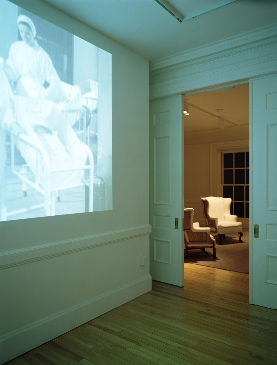 Viewers are drawn into the first room of Everlasting: New England by a large video projection, depicting a never-ending stream of nurses wheeling babies through a hospital doorway. Once inside, voices in the second room can be heard and audience members are invited to enter a room where the furniture has been stripped bare of its covering and the rug removed from the floor, with only the pad left behind. There they can sit in the chairs and listen to the 5-track audio piece composed by Fessler.