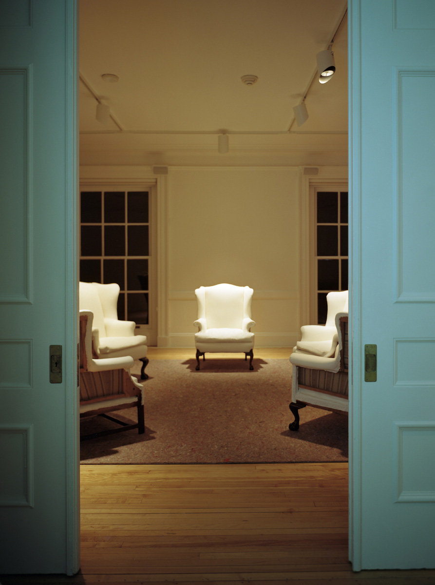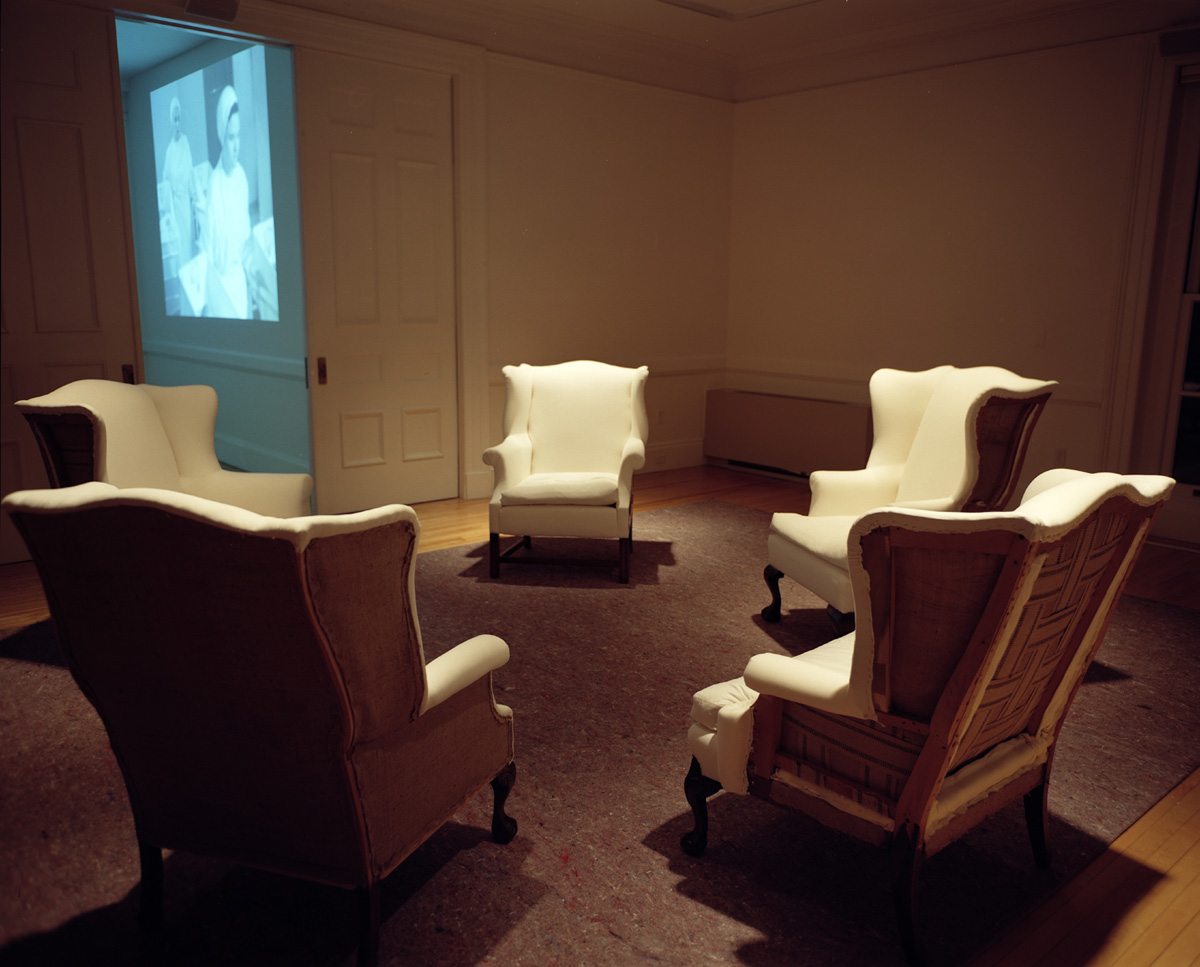 Medium: Site-specific surround-sound audio piece composed from oral history interviews with 54 women from New England; 5 altered wing chairs; rug pad; video projection.