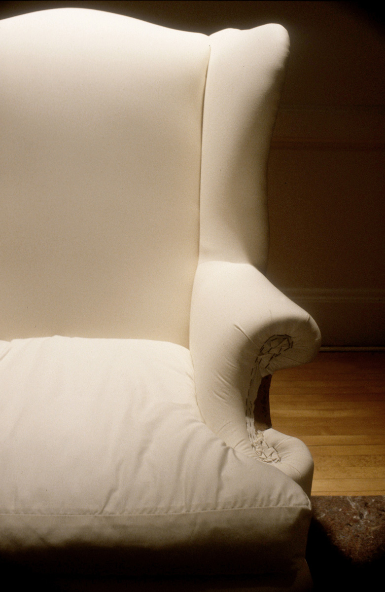 Fessler acquired old wing chairs and worked with an upholsterer who could adapt them to her design. She wanted the chairs to be inviting and comfortable, but also appear vulnerable and exposed. They were constructed so viewers could see under the skin, to the bones of the chairs.