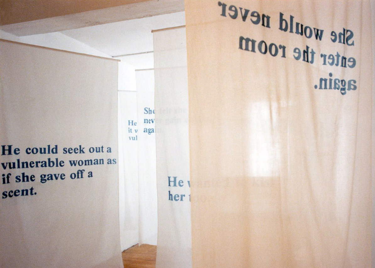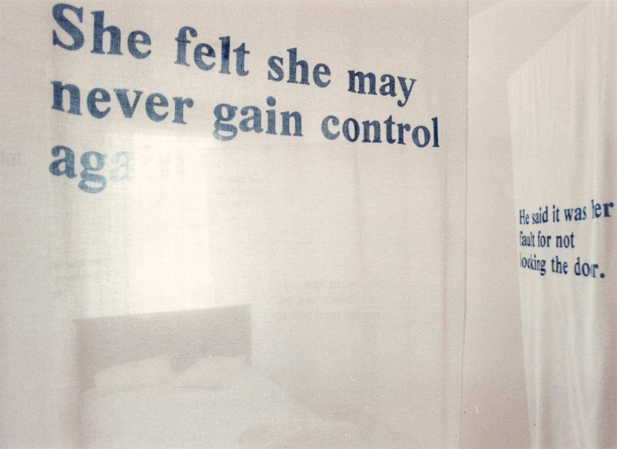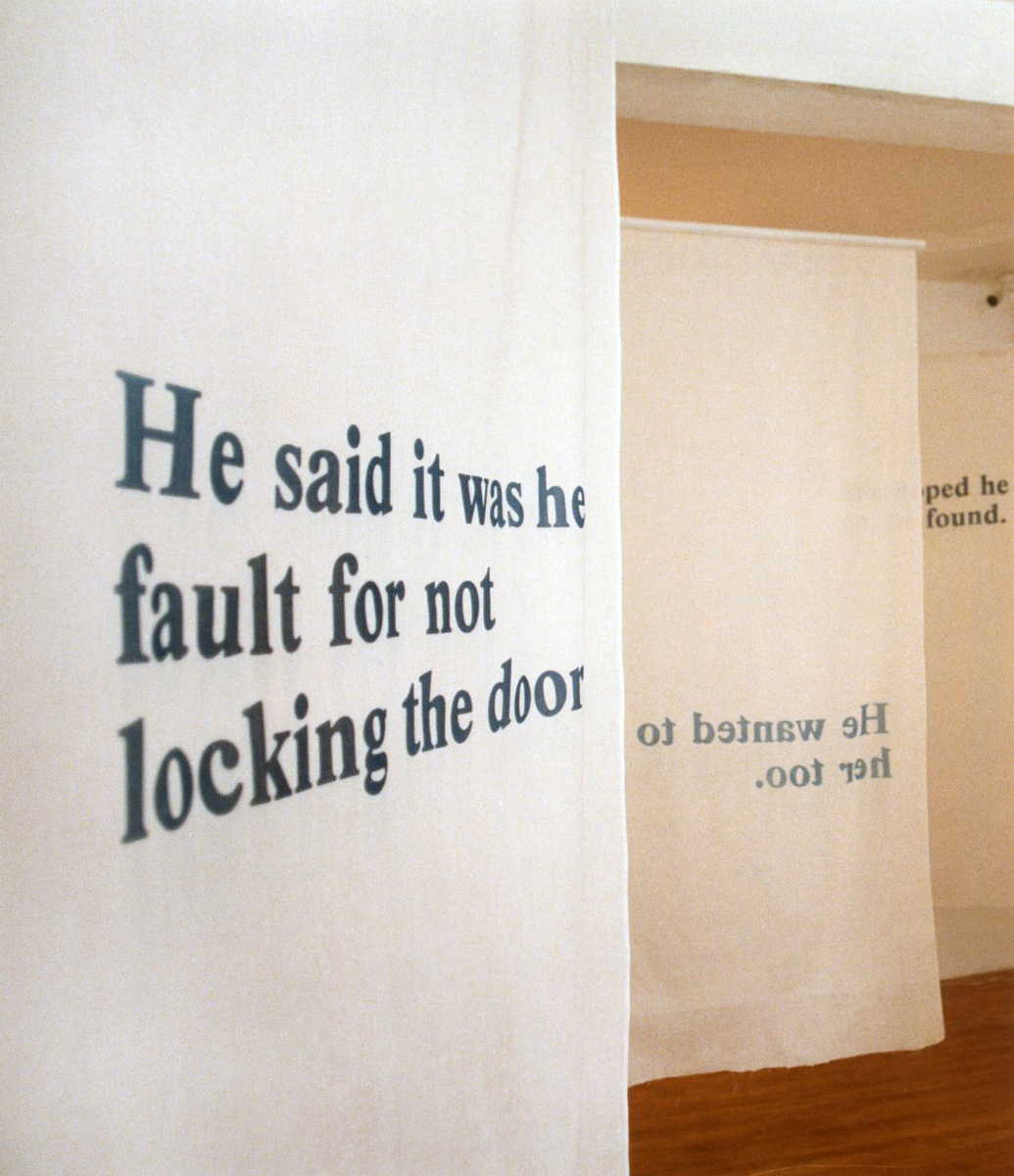 In Rape: A Crime Report, 1984, viewers enter a room filled with a maze of sheer cotton organdy panels on which simple declarative sentences are exposed using the cyanotype photographic process. Sentences that begin with “He” or “She” are a distillation of multiple accounts gathered through interviews and research by Fessler, and refer to the psychological state of both the woman and man involved. “He said it was her fault for not locking the door.” “She was more afraid for her children in the next room.” The sentences are printed at varying heights on the semi-transparent fabric, allowing viewers to see through one cloth to the next, but the specific words are hazy, and as viewers move closer to read them and find themselves entangled deeper in the maze.