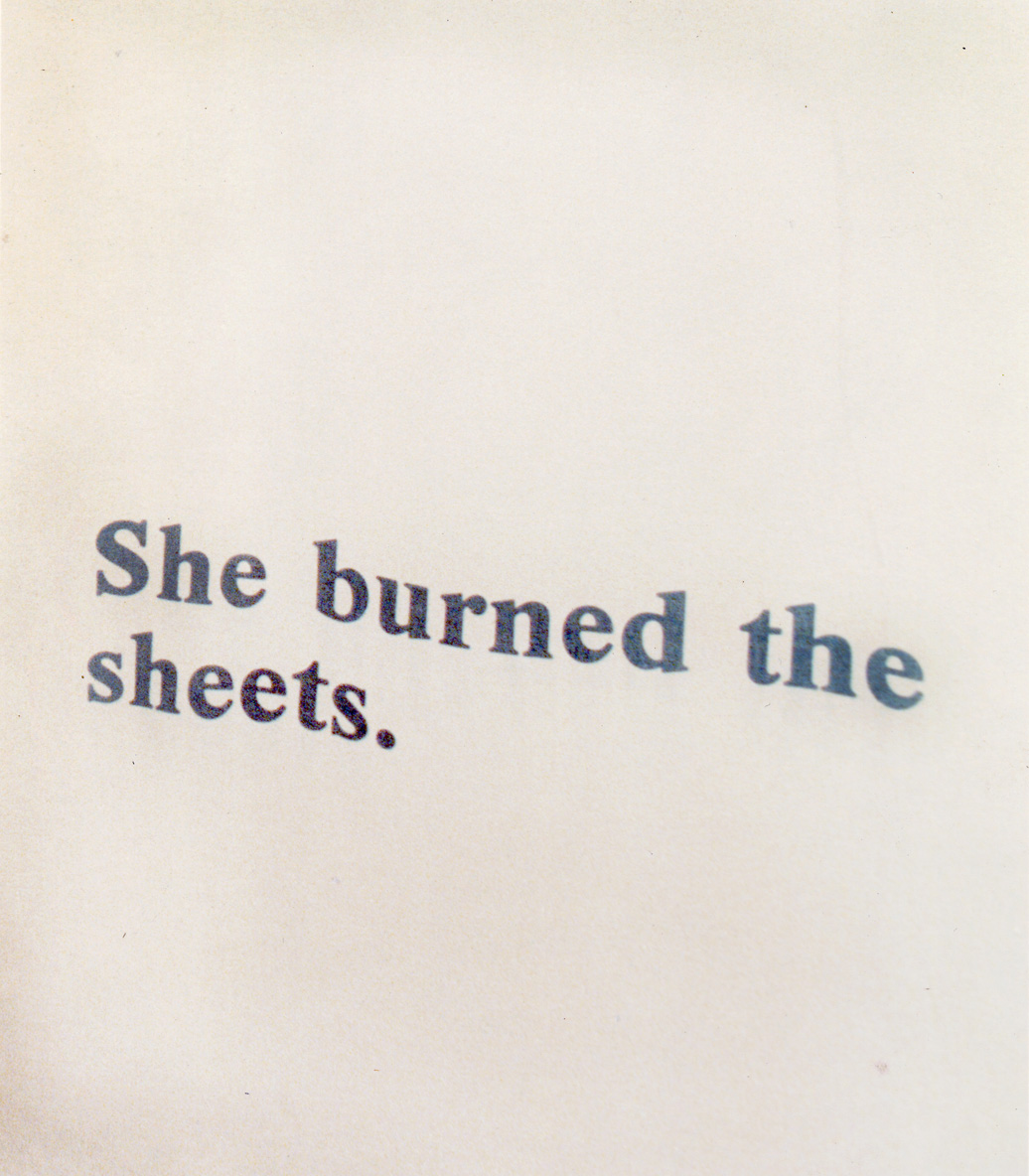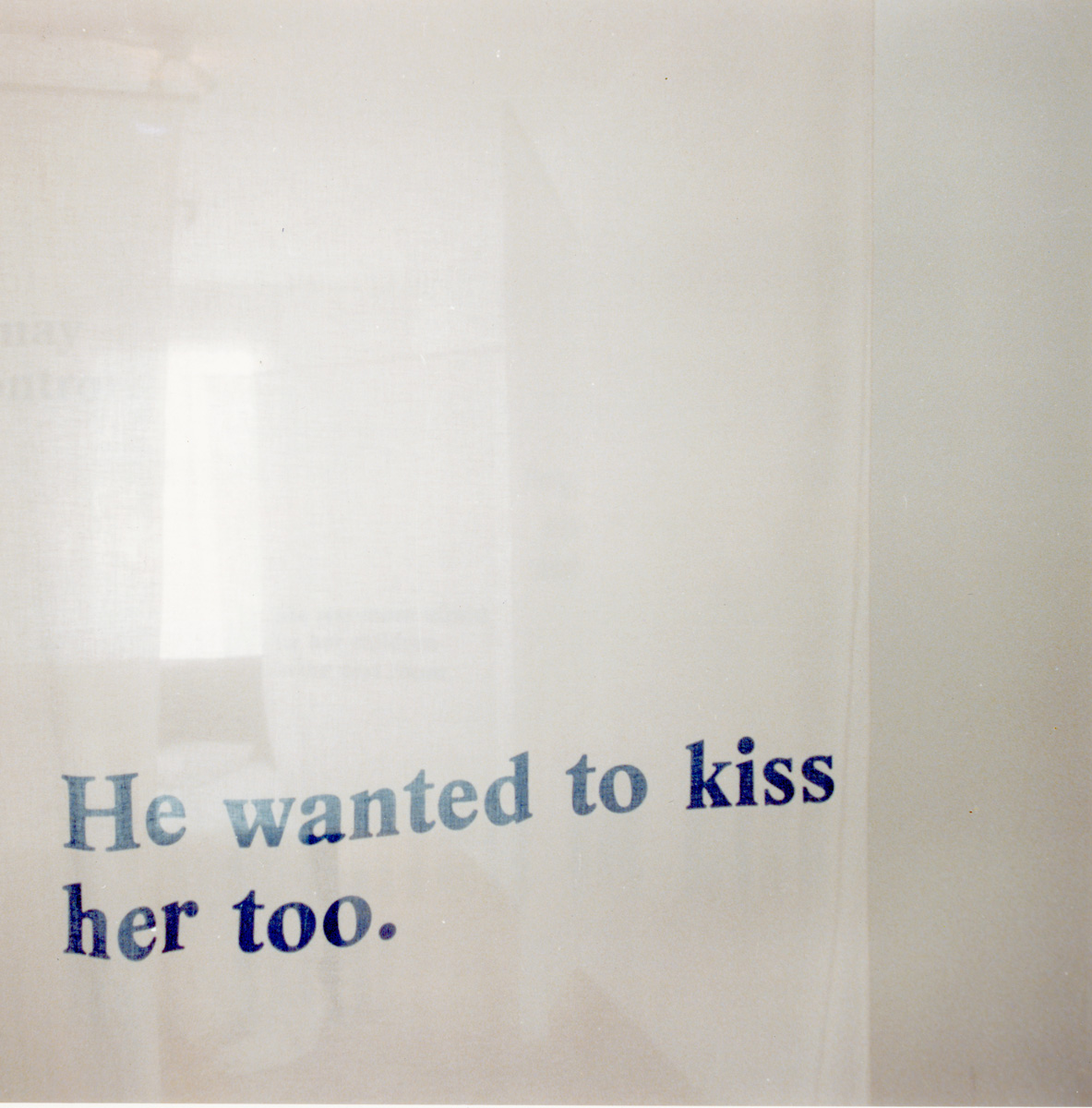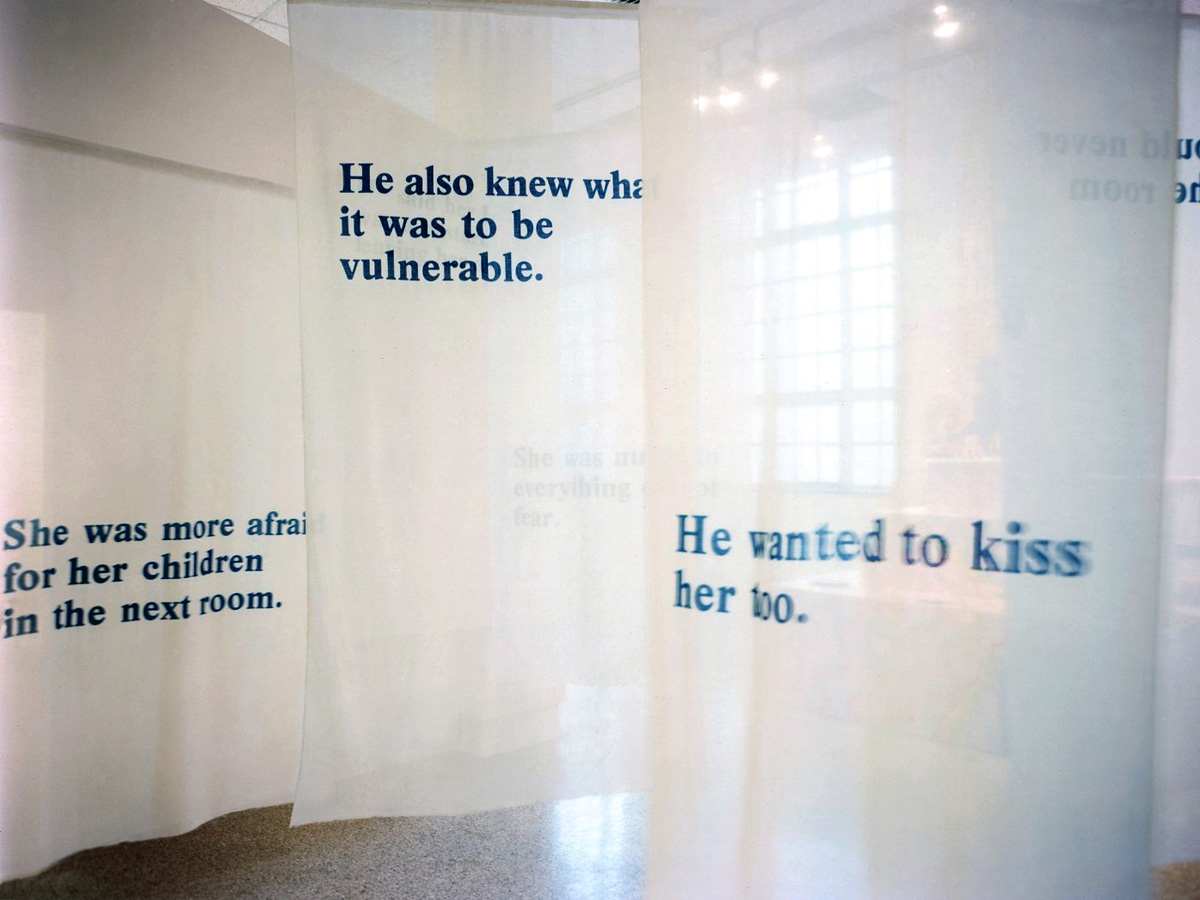 In Rape: A Crime Report, 1984, viewers enter a room filled with a maze of sheer cotton organdy panels on which simple declarative sentences are exposed using the cyanotype photographic process. Sentences that begin with “He” or “She” are a distillation of multiple accounts gathered through interviews and research by Fessler, and refer to the psychological state of both the woman and man involved. “He said it was her fault for not locking the door.” “She was more afraid for her children in the next room.” The sentences are printed at varying heights on the semi-transparent fabric, allowing viewers to see through one cloth to the next, but the specific words are hazy, and as viewers move closer to read them and find themselves entangled deeper in the maze.
