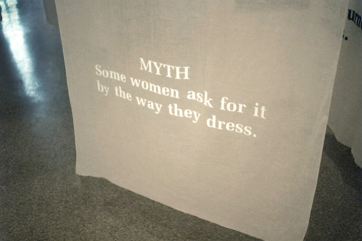 Medium: 11 cotton organdy panels with cyanotype printed text; 1 blank text panel; projected text containing site-specific facts and myths about rape